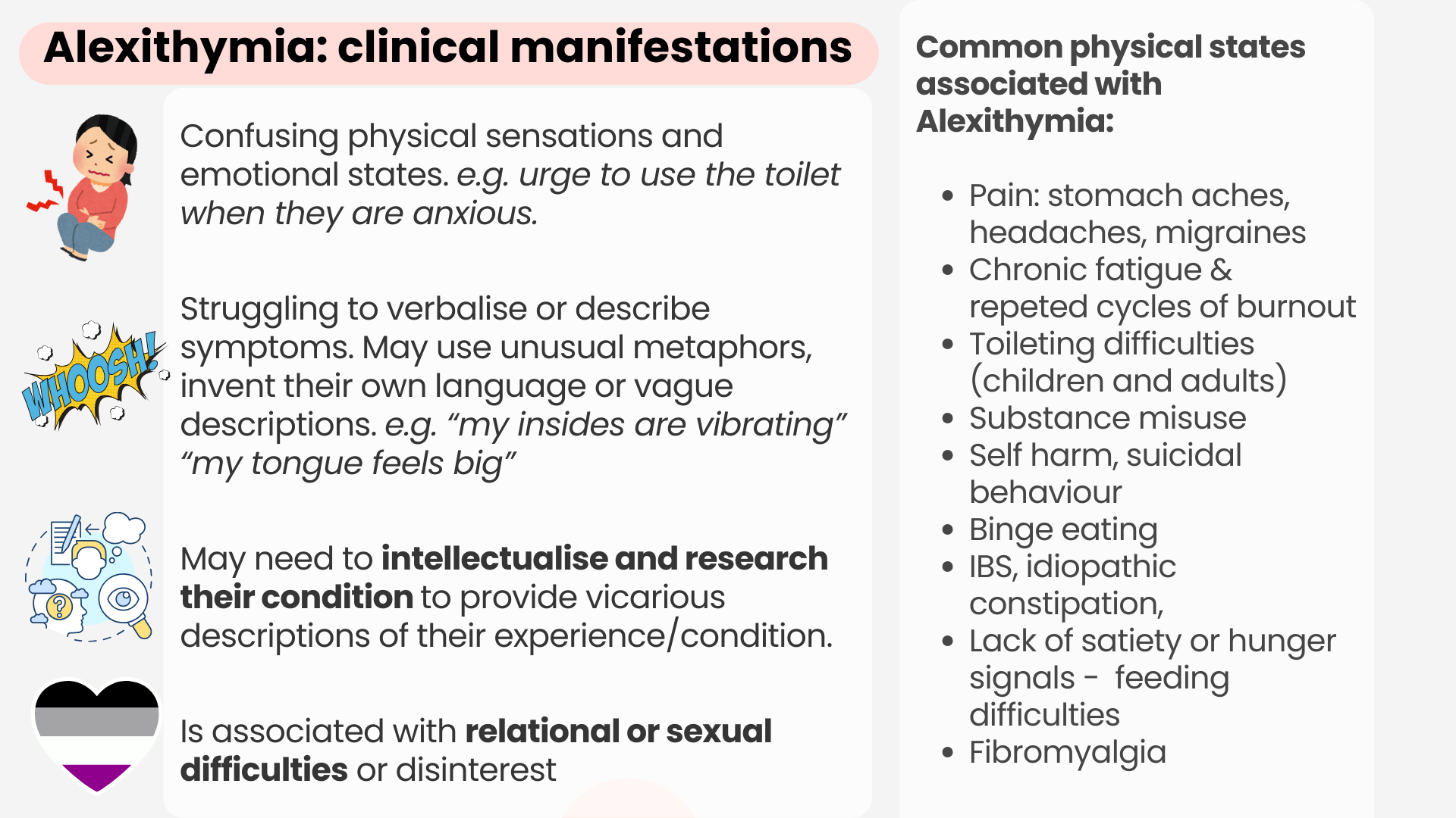 The literal meaning of Alexithymia is “without words for emotion”. Very importantly, it doesn’t mean that the person isn’t feeling emotions, you can be feeling something very strongly, just not able to identify or verbalise them.